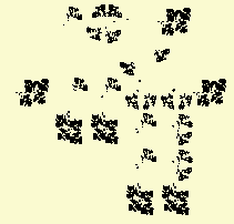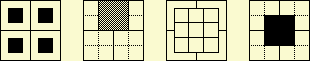 The last one is our goal, with a single depth n-1 RESULT in solid black in the centre, advanced by 2n-2 steps. In the first, each depth n-1 quadrant has a RESULT, which is solid black, and advanced by only 2n-3 steps. We want to create a 3x3 region of such nodes, as in the 3rd diagram, for reasons that will become apparent, and so to do that we need to fill in the remaining plus shape in the middle. We do that using the sort of construction seen in the second diagram.