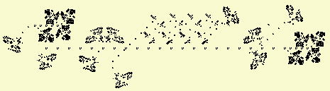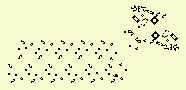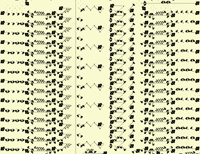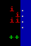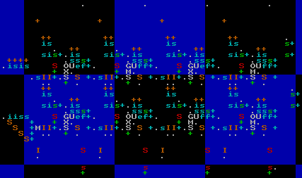 The components have mirrored and rotated versions, too. The rotated versions have node symbols of different colours, and the mirrored ones use upper-case instead of lower-case. The LWSS guns are indicated with + symbols, and have no mirrored forms. There are also nodes with eaters on all 4 sides, and nothing else; these are to end LWSS streams coming from any direction and have a single full stop as their node symbol. Here's what the above pattern looks like in thl:
