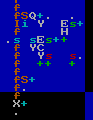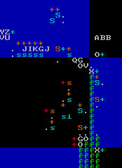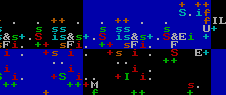 Without describing it in unnecessary detail, thl has one more important feature: Node symbols. As you can see in the image above, nodes in which all cells are dead are displayed as space characters. Others are displayed as random white upper-case characters. The same node will be displayed as the same upper-case character (although it may change between different invocations of the programme). However, some have node symbols, which can be any character and any colour; they are specified in the file itself, and are persistent. This makes it easy to recognise commonly copy/pasted components.