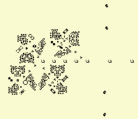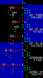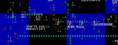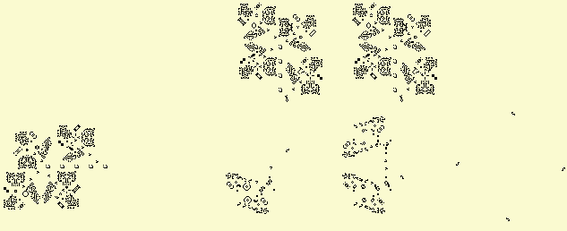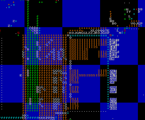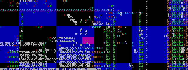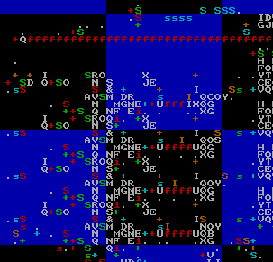 Anyway, back to thl. The interface allows you to pan the camera and move a cursor around, and copy/paste rectangular selections. Most importantly, it allows you to zoom in and out and operate on nodes at any chosen zoom level, referred to as z. At z=0, each character in the terminal is a cell. At z=1, each character is a 2x2 of cells, etc. The selection tool also accomodates this; if you copy/paste a 5x5 region at zoom 10, it takes the same amount of time to do so as if you did it at z=0, despite the fact that you are copying 410 times as many cells. No other programme to my knowledge has this feature.